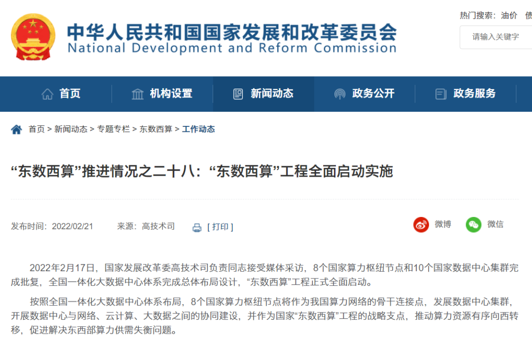 2022年2月,国家发展改革委、中央网信办、工业和信息化部、国家能源局联合印发通知,同意在京津冀、长三角、粤港澳大湾区、成渝、内蒙古、贵州、甘肃、宁夏等8地启动建设国家算力枢纽节点,并规划了10个国家数据中心集群。至此,全国一体化大数据中心体系完成总体布局设计,“东数西算”工程正式全面启动。这是继“南水北调”“西电东送”“西气东输”后的又一次国内资源调配的大工程。