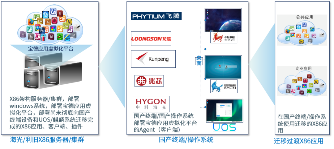 随着业务发展和国产化的需求,该单位采购了一批信创PC用作日常办公,但是应用面临多重阻碍:原本的管理软件无法将这批信创终端纳入管理,网络安全软件需要硬件加密狗的支持而无法完全替换x86环境,现网的部分设备的驱动需要x86环境支撑……该单位迫切需要一个可靠的解决方案,既可以支持全国产化改造期间的办公需求又能够统一管理后续新采购的信创终端。此时,黄金城hjc官方登录网站信创桌面云亮剑而出,携手黄金城hjc官方登录网站信创应用虚拟化平台,力助客户国产化应用平滑迁移。